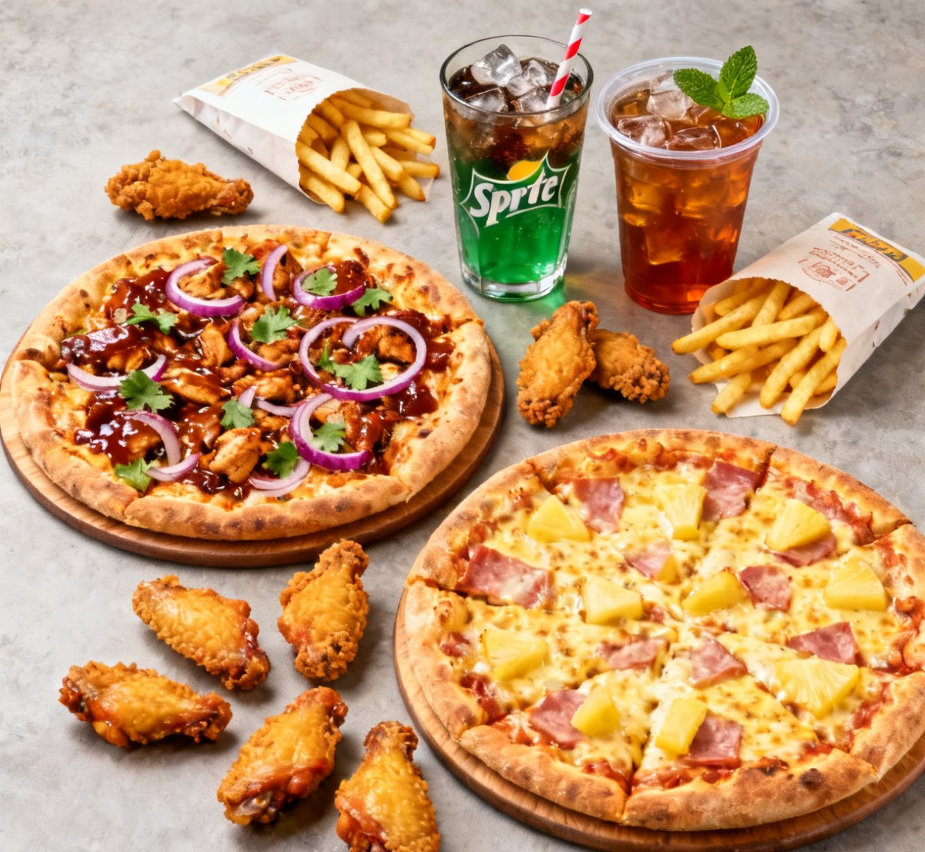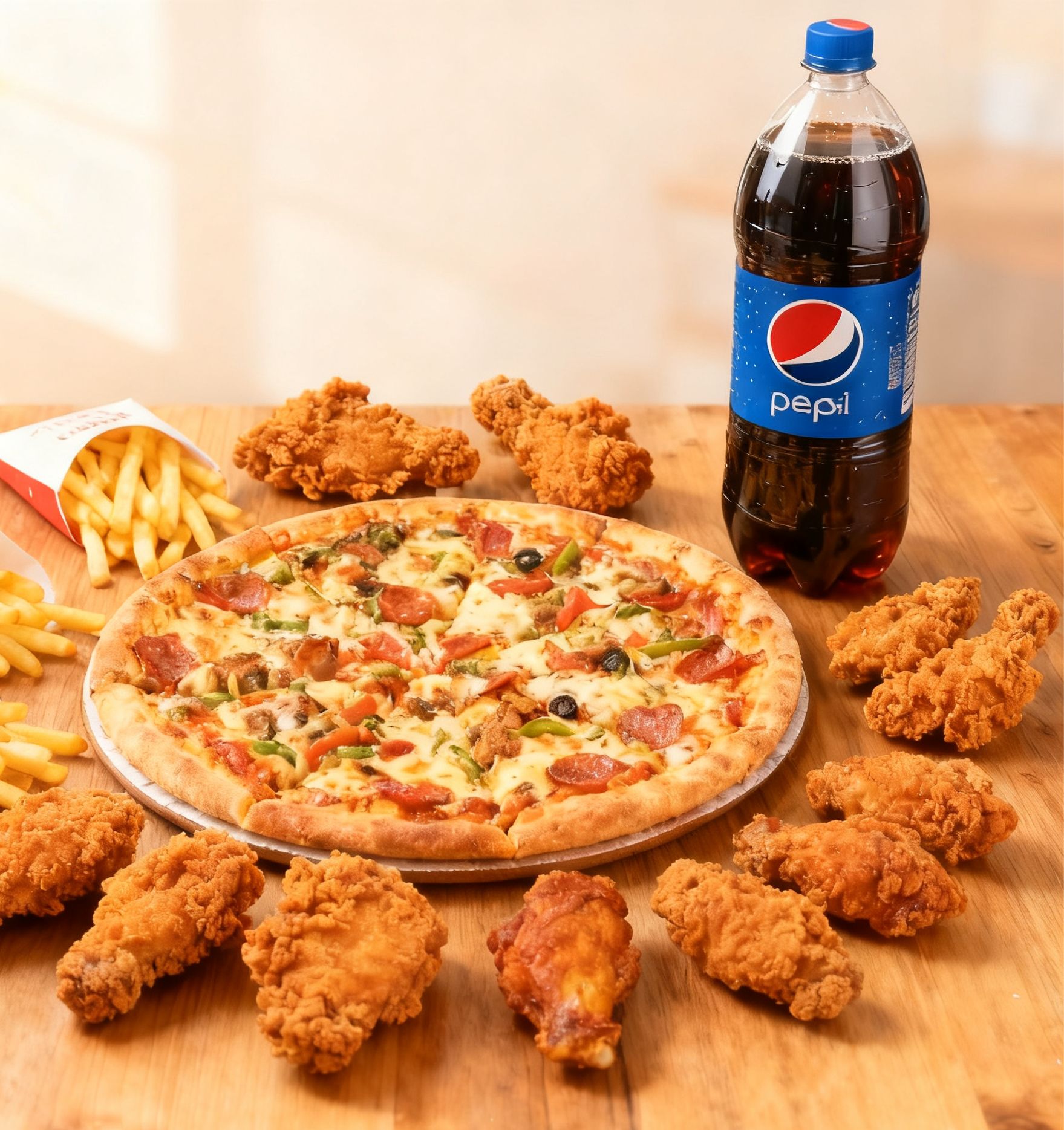12" PIZZA, 6 PCS CHICKEN, 4 HOT WINGS, 2X REG FRIES, 1.5L TANGO ORANGE