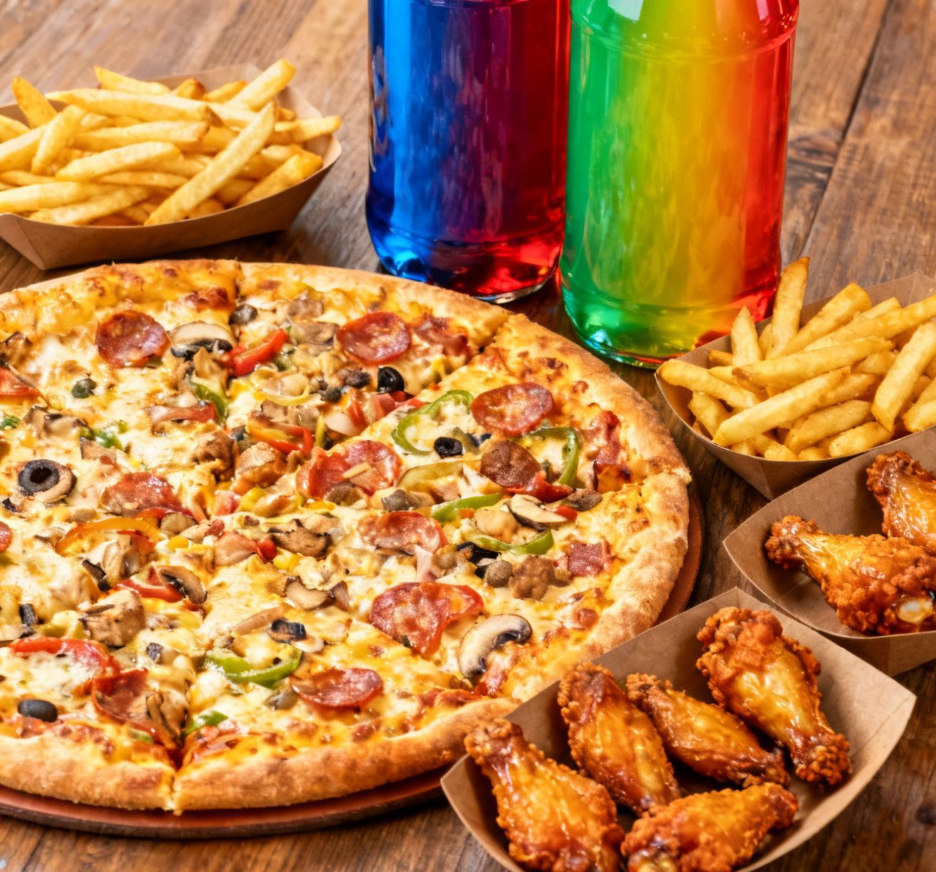 15" PIZZA, 8 PCS CHICKEN, 8 HOT WINGS, 3X REG FRIES, 1.5L TANGO ORANGE