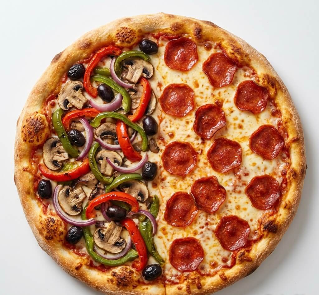 Best of Both Pizzas, Two flavours in one - share with a friend or Feast yourself a treat! with double the toppings.